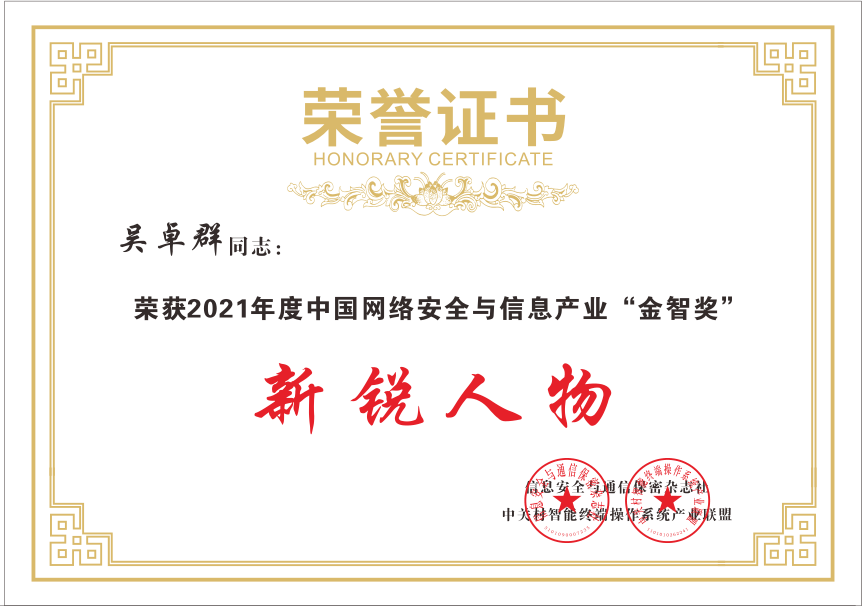 近日,由信息安全与通信保密杂志社主办,中关村智能终端操作系统产业联盟协办的2021年度“中国网络安全与信息产业金智奖”(以下简称“金智奖”)评选正式揭幕。安恒信息总经理吴卓群荣获“新锐人物”安恒信息物联网安全监测平台荣获“优秀产品入围奖”