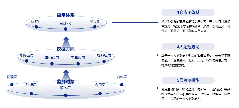 针对新型网络犯罪手段的技术性、犯罪对象的随机性、犯罪行为的非接触性三种独特属性,追猎实验室提出“网络空间治理145体系”,对犯罪分子用以触达用户核心资源载体“Web网址”进行深度画像,预先切断犯罪触角。