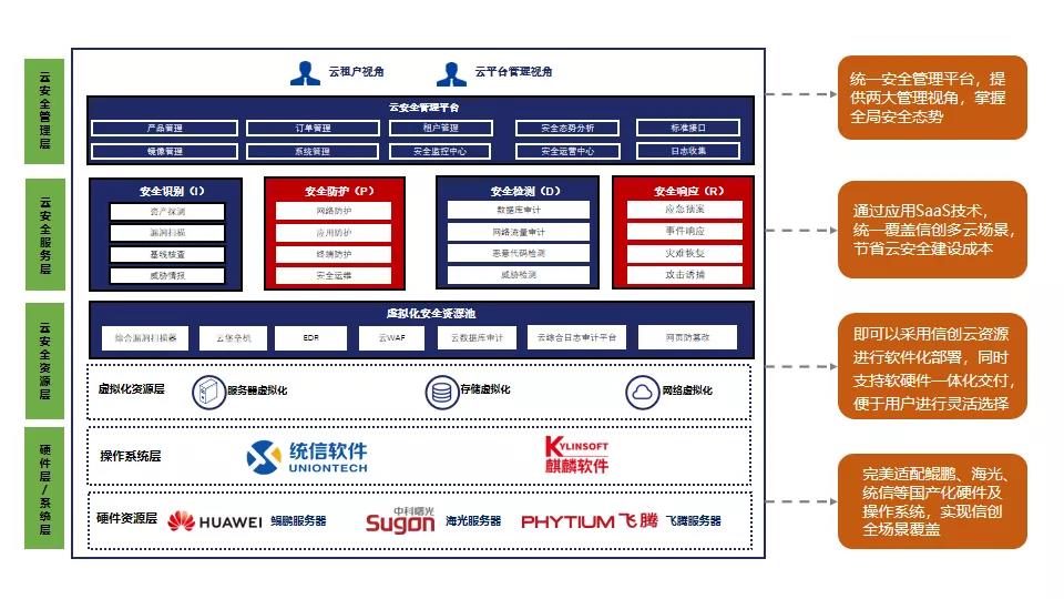 云安全管理层实现统一安全管理平台,提供云租户和云平台两大管理视角,掌握全局安全态势;云安全服务层通过应用SaaS技术,统一覆盖信创多云场景,节省云安全建设成本;云安全资源层即可以采用信创云资源进行软件化部署,同时支持软硬件一体化交付,便于用户进行灵活选择;硬件层完美适配鲲鹏、海光、统信等国产化硬件及操作系统,实现信创全场景覆盖。