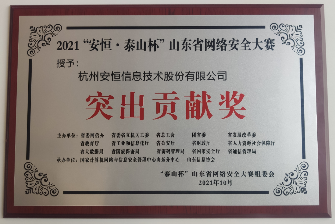 安恒信息作为独家冠名和技术支持单位,一如既往的协助做好赛事的有关组织工作,竭尽全力、周密安排,高质量、高水平地完成承担的各项任务,确保大赛各项活动顺利进行,获得大赛组委会高度认可,授予突出贡献奖。