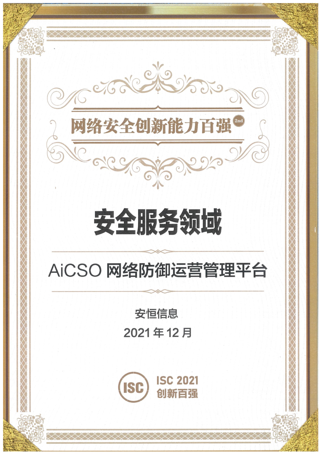 14日,在由ISC平台发起的“第二届ISC网络安全创新能力百强评选活动”颁奖典礼上,安恒信息凭借创新产品“AiCSO网络防御运营管理平台”在安全服务领域入围百强。