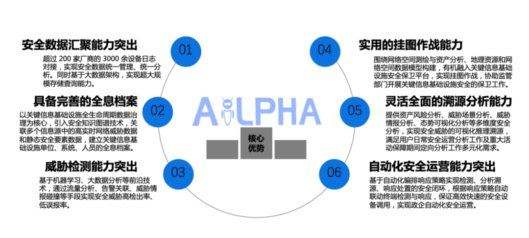 IDC报告称:安恒信息态势感知依托在安全领域十几年的技术沉淀积累及多年来的行业实践,坚持自主创新,实现对安全威胁全生命周期管理,帮助企业实现安全运营闭环。六大优势具体表现为: