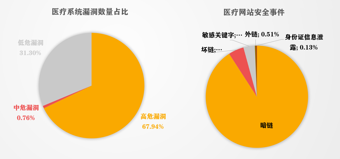 同时,在1500余家医疗网络/系统中,存在高危安全事件105起。通过进一步分析得出:医疗网络/系统中主要存在暗链2828起、坏链152起、敏感内容112起、外链6起。