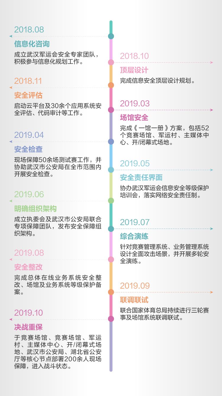 安恒信息高度重视武汉军运会网络安全保障任务,早在2018年8月就集结了核心安全专家团队全力筹备前期关键工作。历时一年有余,从前期风险排查到后期现场值守,共投入了200余安全专家、技术骨干。
