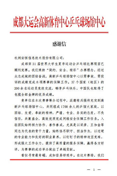 在成都市委市政府及成都大运会执委会感谢信中,对于此次安恒信息在成都大运会以赛谋城、网络安全保障、市场开发、品牌传播等角度给予高度评价,并期待“作为‘赛事名城合伙人’之一,在成都未来的国际赛事中看到安恒信息的身影。”