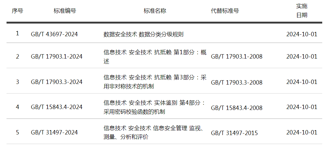 近日,国家市场监督管理总局、国家标准化管理委员会发布的中华人民共和国国家标准公告(2024年第1号),全国网络安全标准化技术委员会归口的5项网络安全国家标准正式发布。具体清单如下: