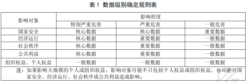根据数据影响对象和影响程度,确定数据为核心数据、重要数据或一般数据,概括的级别确定规则表如下。并列出了一些需要综合确定级别的详细案例。