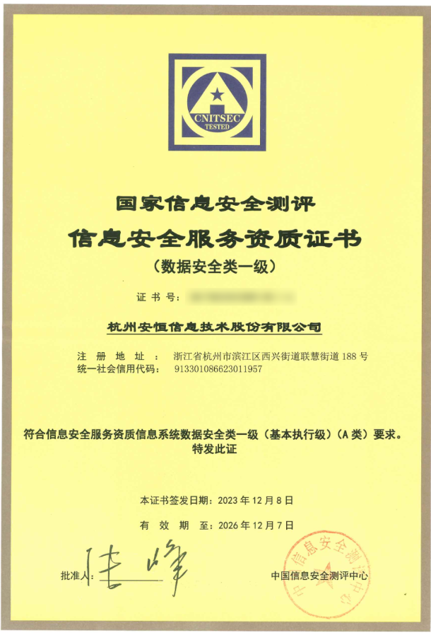 安恒信息于2023年12月首批获得国家信息安全服务数据安全类一级资质。安恒信息数据安全咨询服务体系自发布以来旨在深度参与客户数据安全体系规划、建设落地到运营的全过程,持续提升数据安全能力成熟度水平,除了分类分级咨询服务外,其完整的主线可以概括成“设目标、定框架、数分类、数分级、看现状、识风险、立制度、设策略、制架构、落能力、融流程、验效果”,可提供的核心服务包括八大类:数据安全顶层规划、分类分级、合规评估、DSMM差距评估、风险评估、治理咨询、防泄密体系、运营体系设计咨询服务。