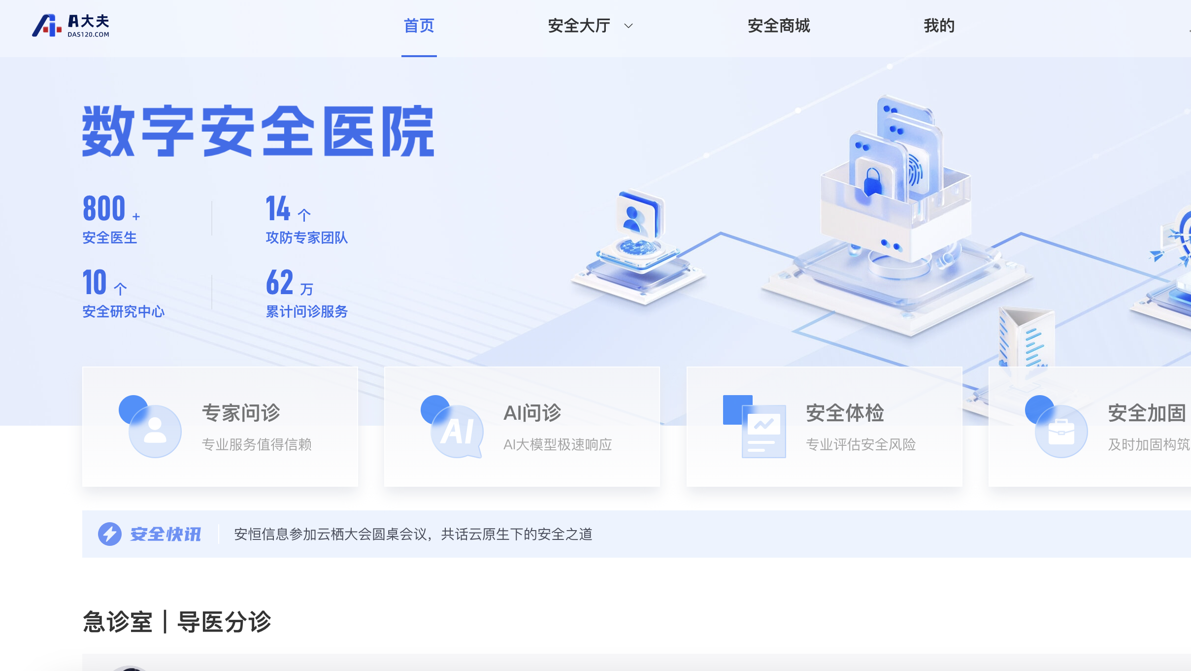 A大夫·数字安全医院在线服务平台 发布,切实解决中小微企业安全看病难问题。依托AI大模型,为广大中小企业提供物美价廉的安全服务,助力企事业单位提升网络安全防护能力。