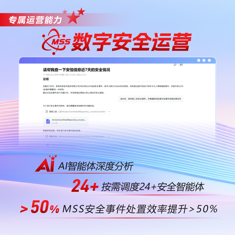 安全托管运营,安全事件全流程自动化分析、研判、通报、处置闭环,智能安全运营,7*24H守护您的网络安全!